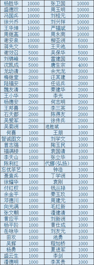 本次活動(dòng)的圓滿開展,得益于孝感片(籍)會(huì)員的慷慨解囊,并為此付出了大量的時(shí)間和精力,在此一并表示感謝!以下為贊助會(huì)員名單(贊助款單位:元):